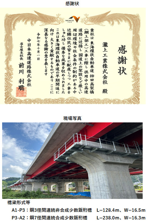 当社が施工した東海環状自動車道 柿田高架橋(鋼上部工)工事の施工にあたり、供用中の高速道路に近接し、国道上の架設など厳しい周辺環境や社会条件の制約がある中、近隣住民の皆さまに配慮しつつ、工事を竣功し、優秀な成果を収めたこと。これは東海環状自動車道の早期開通に向け、大きく貢献するものであり、深甚なる感謝の意を表すものとして表彰を受けました。
