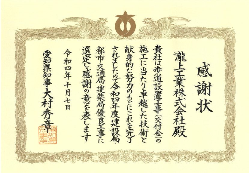 当社が施工した松葉橋【歩道設置工事(交付金)】の施工に当たり卓越した技術と献身的な努力が認められ、優良工事として愛知県知事より表彰を受けました。