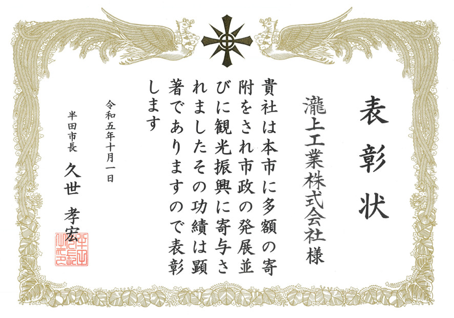 半田市制86周年記念式典が2023年10月1日(日)に開催され、市政の発展並びに観光振興に寄与されたとして表彰状を賜りました。