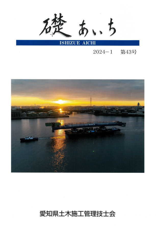 衣浦大橋の曳航写真が愛知県土木施工管理技士会機関紙「礎あいち」2024-1 第43号の表紙に採用されました。