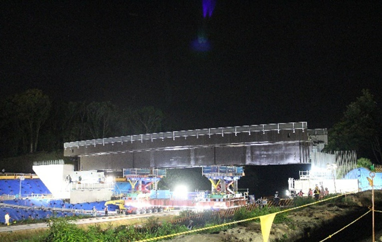 東名高速道路上の跨道橋(西阿知和橋)を多軸式特殊台車を用いて架設しました。【工事名】:岡崎市阿知和地区工業団地造成事業 西阿知和橋新設工事令和7年7月12日(土)から令和7年7月13日(日)の夜間にかけて、東名高速道路(上下線)豊田JCT~岡崎IC間を夜間通行止め規制し、跨道橋の架設を行いました。本工事は、岡崎市による岡崎市阿知和地区工業団地造成事業の一環として、橋梁を架け替える工事です。