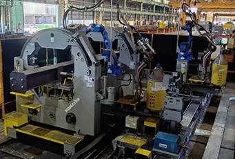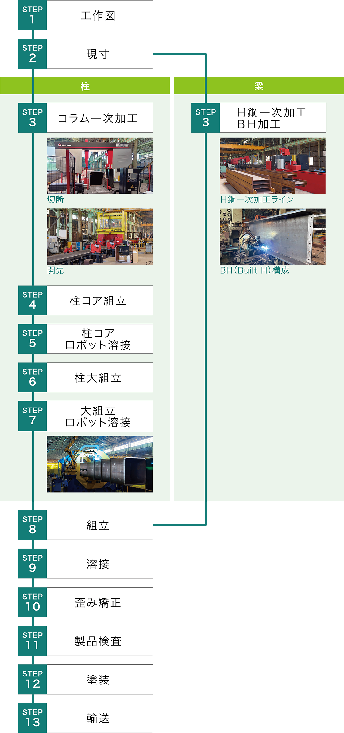 加工工程には鋼材の切断、開先、孔明、曲げ加工などがあり、現寸によって作成された部材情報に従って、⼀次加⼯機(コラム、H鋼ライン)、NCガントリー形高速ドリル等の専用工作機械により加工されます。組立工程では柱仕口組立治具や柱大組立治具、溶接工程では連結コア溶接ロボットや柱大組立溶接ロボットを導入し、製作の合理化・効率化が進んでいます。