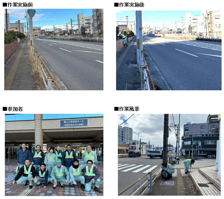 2025年12月26日(金)に、社長をはじめ総勢11名の従業員で、愛知県半田市の「瀧上工業雁宿ホール」周辺の清掃活動(草取り)を2時間ほど実施させていただきました。