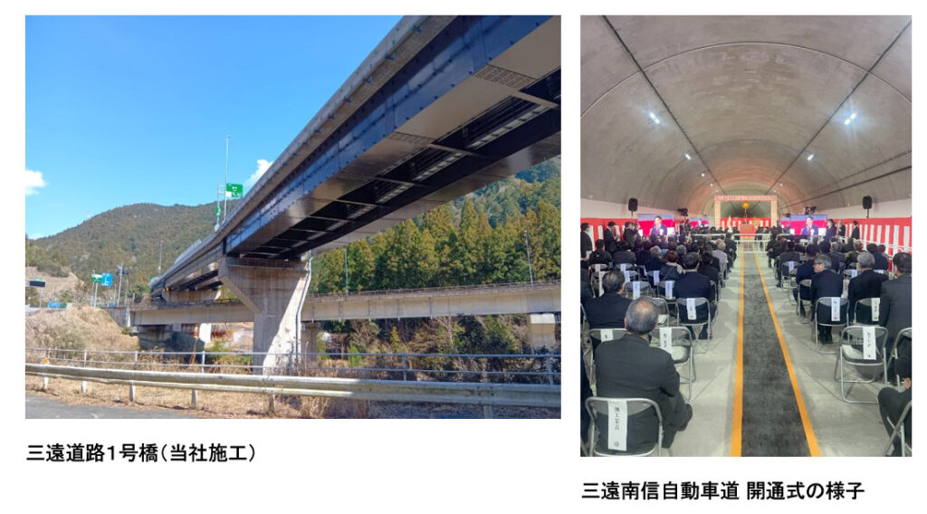 2026年3月14日、晴天に恵まれたなか、三遠南信自動車道の一部区間が開通し、現地にて開通式が行われました。本路線は、愛知県・静岡県・長野県を結ぶ重要な道路として、地域間の移動や物流を支え、今後の地域づくりに大きな役割を果たすことが期待されています。当社・瀧上工業は、三遠道路1号橋の施工を担当し、安全を最優先に、一つ一つの工程を丁寧に進めてまいりました。完成したトンネル内で行われた開通式には、多くの関係者が出席し、道路の完成と新たなスタートをともに祝いました。今回の事業に携わることができたことに感謝するとともに、今後も社会基盤整備を通じて、地域の発展に貢献してまいります。